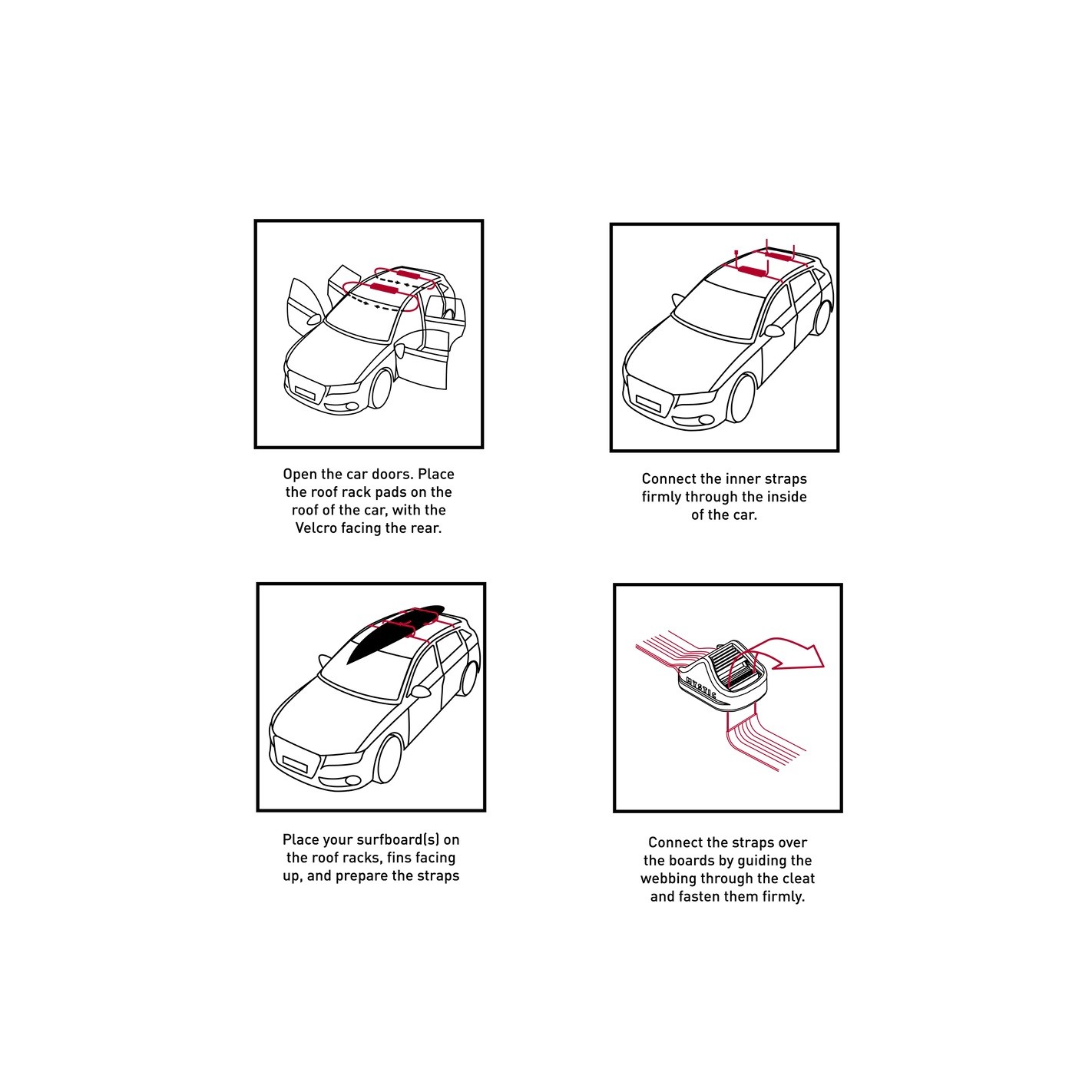 Make your journey easier with the Roofrack System, which safely carries your boards on the bare roof of your car. No square roofrack is needed for this system, which was designed to fit all car models. The foam protects both your car and the boards, making sure they both get from point A to point B safely