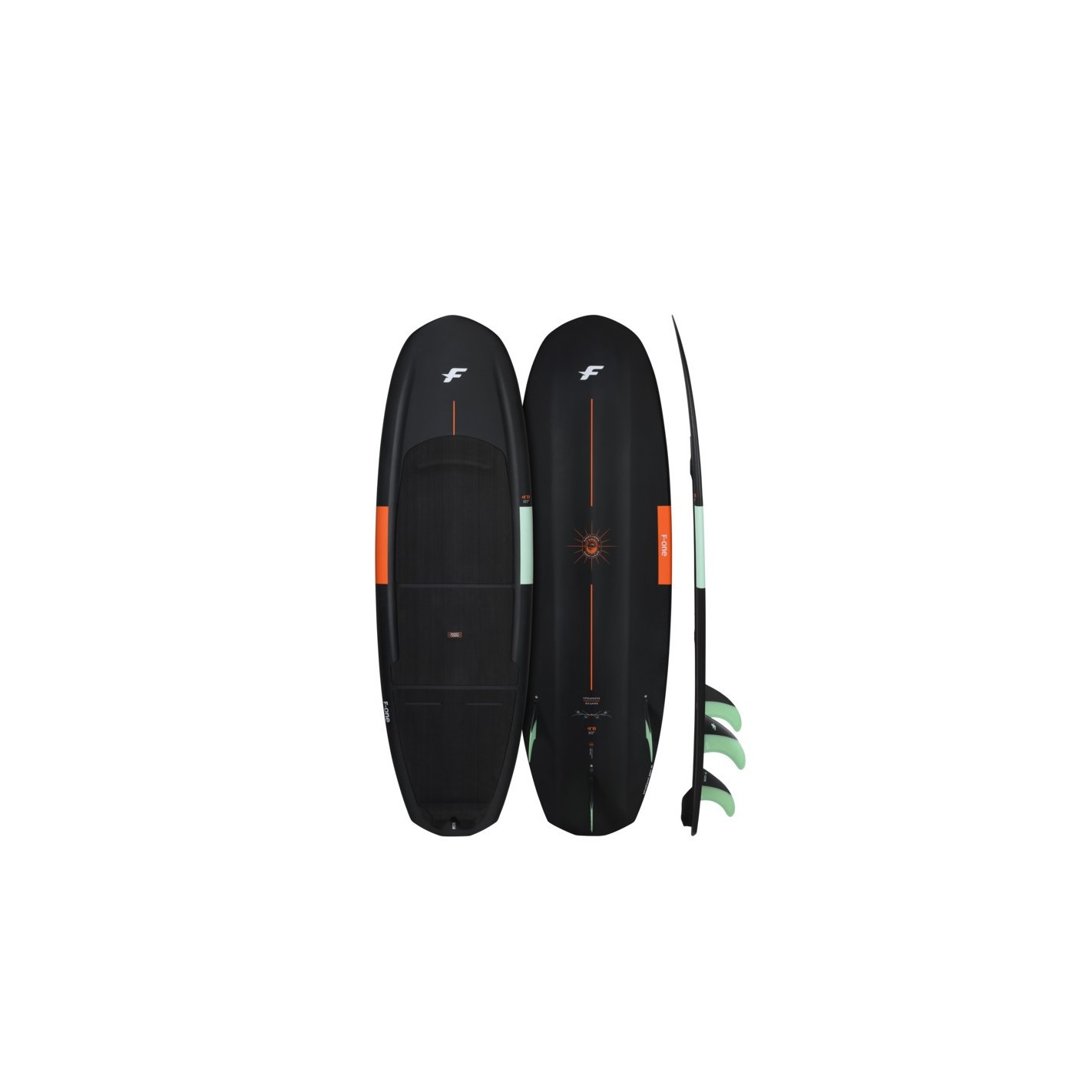 This board is available in 4’11 and 5’1. It is equipped with a set of F-ONE Flow Carbon M for the front fins, and of F-ONE Flow Carbon XS for the rear fin.